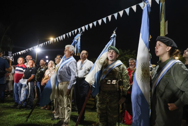 En acto se entonó el Himno Nacional Argentino con el acompañamiento de la Banda del Regimiento de Infantería de Monte XXX. Después, la Milicia Patriótica y veteranos depositaron ofrendas de laureles en representación del pueblo, tras lo cual se realizó un minuto de silencio en honor a los caídos.