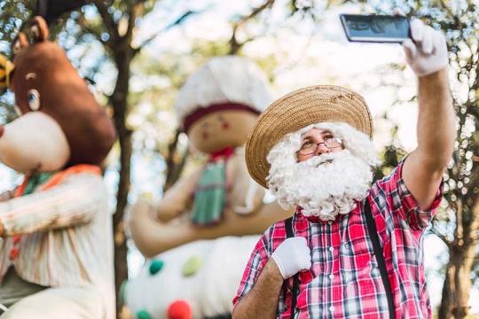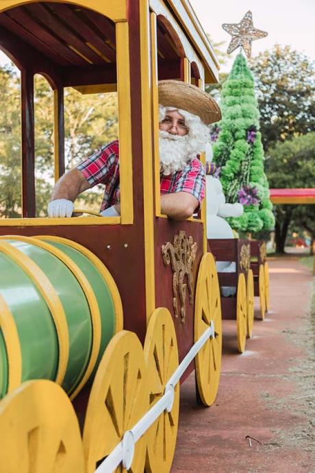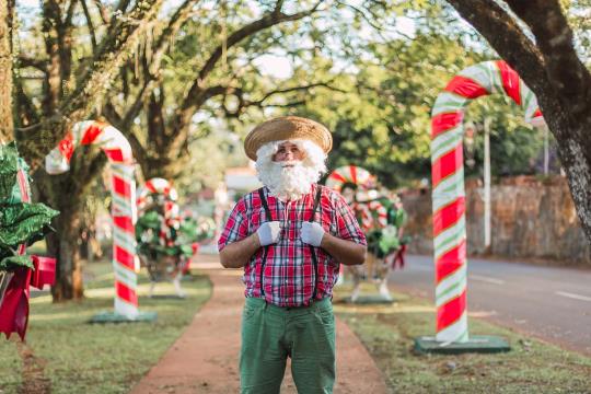 Destaca la presencia del Papá Noel con sello misionero, adaptado a las costumbres y al calor de la tierra colorada, incluyendo su cambio de su típica vestimenta por bermudas y camisa mangas cortas.