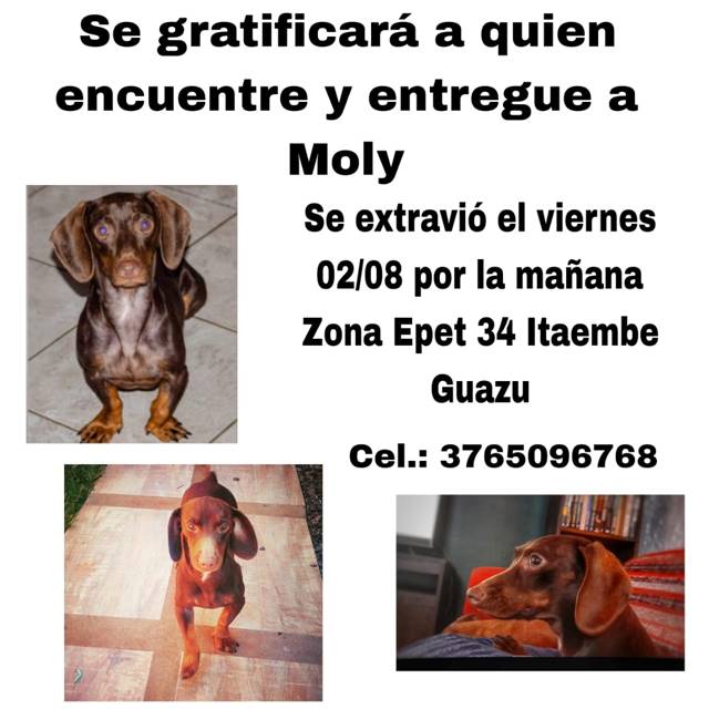 Vale decir que habrá gratificación para quien pueda colaborar fehacientemente a regresar a Moly a su hogar.