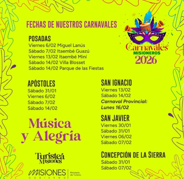 La edición 2026 comenzó el 31 de enero en la localidad de Apóstoles y se extenderá hasta el 16 de febrero, fecha en la que se llevará a cabo el Carnaval Provincial, instancia que reúne a comparsas de distintos puntos de Misiones en un encuentro que celebra el trabajo, la pasión y la tradición del carnaval.