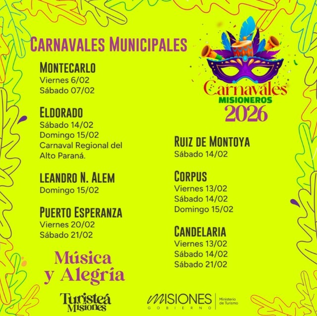 A lo largo de varias jornadas, cada municipio ofrece su propia impronta, invitando a vecinos y visitantes a disfrutar de desfiles, comparsas, espectáculos y propuestas culturales que convierten al carnaval en una experiencia imperdible del verano misionero.