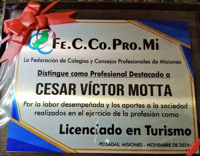 El Colegio de Profesionales en Turismo de Misiones distinguió como "Profesional destacado del 2024" al Director de Turismo de la Municipalidad de El Soberbio, Lic. Victor Motta (MP-L 251).